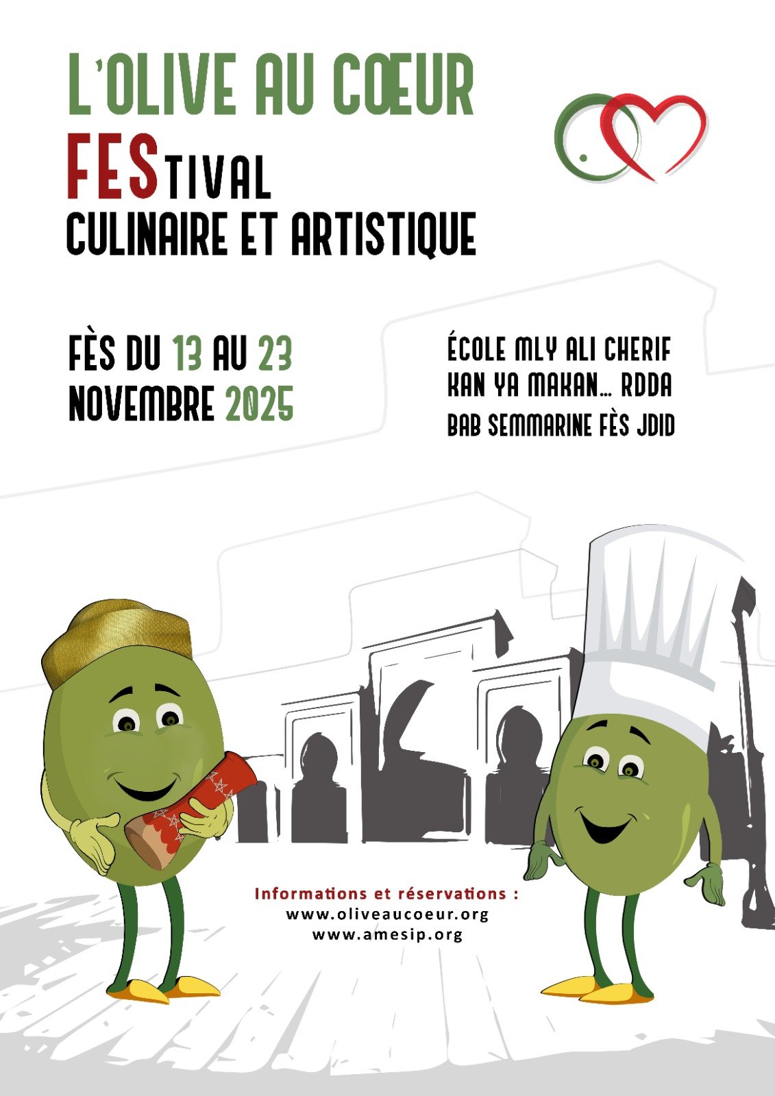 L’Olive au Cœur est un festival pluridisciplinaire porté par les jeunes de l’AMESIP, du centre Kan Ya Makkan – RDDA et de l’École des Métiers d’Art (EMA) de Fès. Pensé par et pour la jeunesse, il fait de ces jeunes une véritable force de proposition pour leur ville, en valorisant leurs talents, leurs idées et leur engagement pour un développement humain et durable.